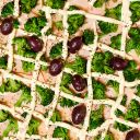 Molho de tomate, brócolis, mussarela, palmito,catupiry, alho e óleo, mussarela e orégano