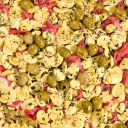 Molho de tomate, strogonoff, milho, mussarela, cheddar e orégano
